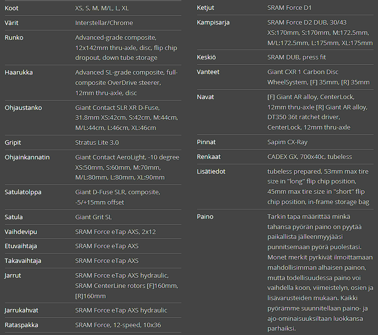 Giant CXR 1 Carbon Disc WheelSystem: Nämä huippuluokan hiilikuitukiekot (35 mm syvät) tarjoavat erinomaisen yhdistelmän keveyttä, kestävyyttä ja aerodynamiikkaa. Ne on optimoitu tubeless-renkaille (esim. CADEX AR tai CADEX GX 700x40c) ja tarjoavat erinomaisen rullaavuuden ja pidon vaihtelevassa maastossa, nostaen gravel-pyöräilyn suorituskyvyn uudelle tasolle.
