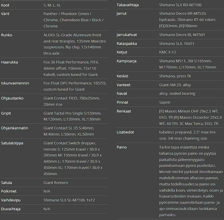 Maestro-jousitusjärjestelmä (135 mm takana / 150 mm edessä): Giantin tunnettu Maestro-jousitus tarjoaa 135 mm takajoustomatkaa, joka on hienosäädetty tarjoamaan erinomaista pitoa, mukavuutta ja hallintaa teknisillä poluilla. Edessä oleva 150 mm joustomatka varmistaa, että selviät suuristakin esteistä ja säilytät hallinnan korkeissa nopeuksissa. Jousituksessa on Advanced Forged Composite -hiilikuituvipu, joka lisää jäykkyyttä ja vähentää painoa.