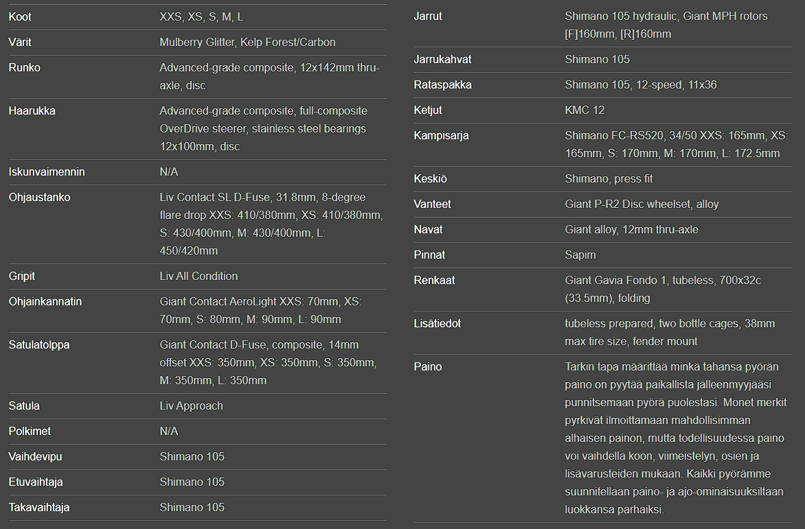 Advanced-Grade Composite -runko ja -etuhaarukka: Livin laadukas hiilikuiturakenne takaa kevyen ja tärinää vaimentavan ajokokemuksen. Runko on suunniteltu tarjoamaan luonnostaan mukavampi ajoasento, mikä vähentää väsymystä pitkillä maantielenkeillä.