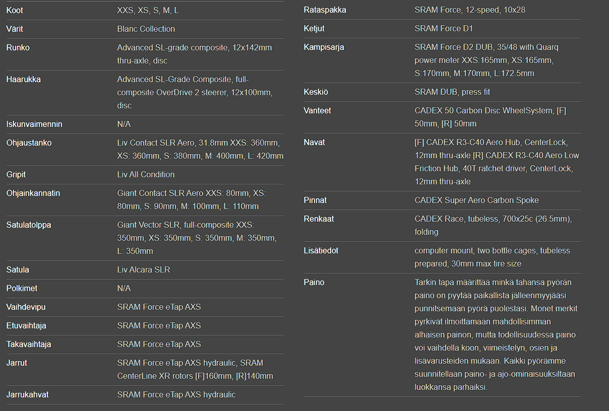 Advanced SL-Grade Composite -runko ja -etuhaarukka: Tämä on Livin kevyin ja aerodynaamisin hiilikuiturakenne, joka on suunniteltu leikkaamaan ilmaa ennennäkemättömällä tehokkuudella. Jokainen putken muoto on optimoitu minimaalisen ilmanvastuksen saavuttamiseksi, varmistaen että jokainen wattisi siirtyy suoraan vauhdiksi.