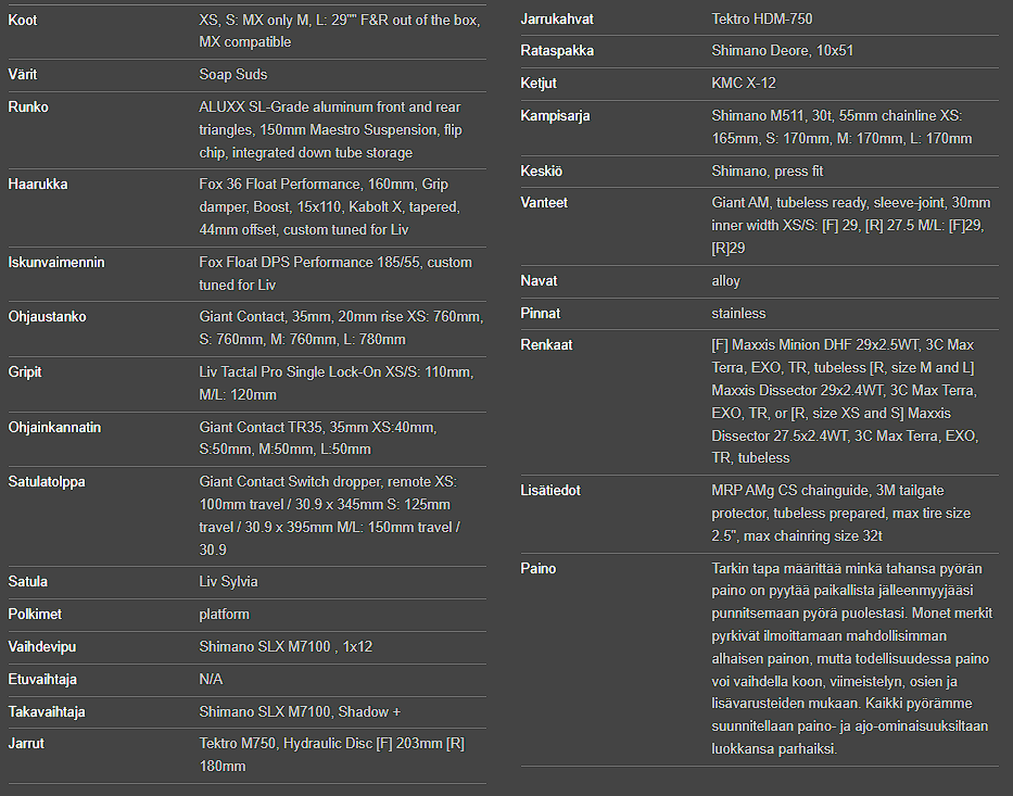Tubeless-valmiit Giant AM -kiekot ja Maxxis-renkaat: Pyörässä on koosta riippuen joko "mullet"-kokoonpano (XS/S: 29" edessä / 27.5" takana) tai molemmat 29" renkaat (M/L-koot). Maxxis Minion DHF ja Dissector -renkaat tarjoavat erinomaisen pidon ja rullaavuuden. Tubeless-valmius parantaa pitoa ja vähentää rengasrikkoja maastoajossa.