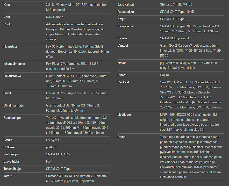 Monipuolinen Maestro-jousitusjärjestelmä (150 mm): Livin tunnettu Maestro-jousitus tarjoaa 150 mm takajoustomatkaa, joka on hienosäädetty absorboimaan tehokkaasti niin suuret iskut kuin pienetkin tärinät. Tämä takaa erinomaisen pidon, mukavuuden ja hallinnan teknisissä maastoissa ja suurissa nopeuksissa.