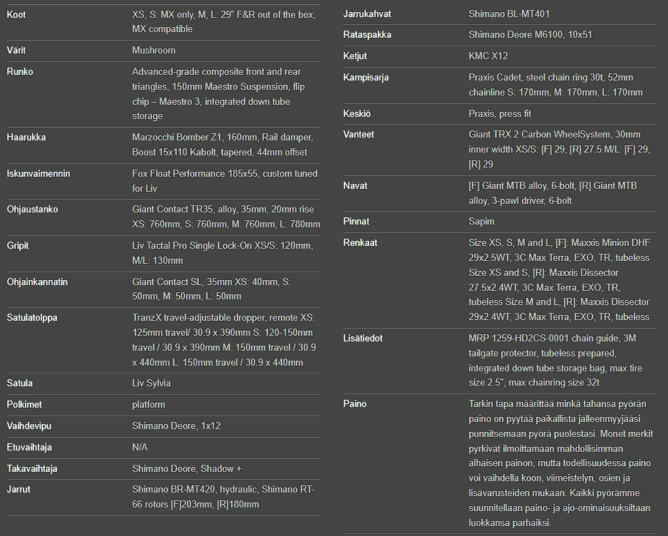 Monipuolinen Maestro-jousitusjärjestelmä (150 mm): Livin patentoitu Maestro-jousitus tarjoaa 150 mm takajoustomatkaa, joka on suunniteltu tarjoamaan erinomaista pitoa, mukavuutta ja hallintaa erilaisilla poluilla. Se vastaa tehokkaasti niin suuriin kuin pieniin iskuihinkin, pitäen pyörän vakaana.